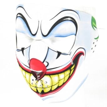 Show off your personality while protecting your face at the same time. Wear this Neoprene face mask for the fun of it as well as for the safety of it. Great for wearing when participating in outdoor sports. Mask is done in a toothy crazed clown face. Has vent holes for ears and mouth. Can be used with ski goggles, and for any outdoor activities. Adjustable back closure, one size fits most. Mask wraps around face and has an adjustable closure at back. Mask measures 9 inches from top to bottom of front. Mask is .10 inches thick.